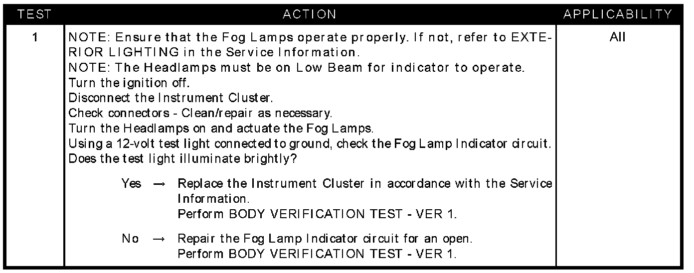 FOG LAMP INDICATOR INOPERATIVE - DOMESTIC