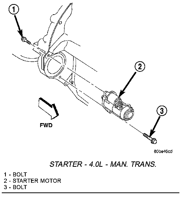 4. 4.0L With Manual Transmission: While supporting starter motor, remove upper bolt (rearward facing) securing starter motor to transmission housing.