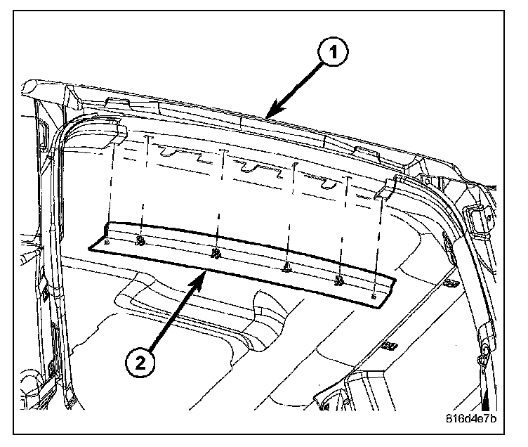 1. Align the retaining tabs on the upper liftgate trim molding with the retaining clips in the liftgate opening and engage the retaining tabs that secure the trim molding to the liftgate opening.