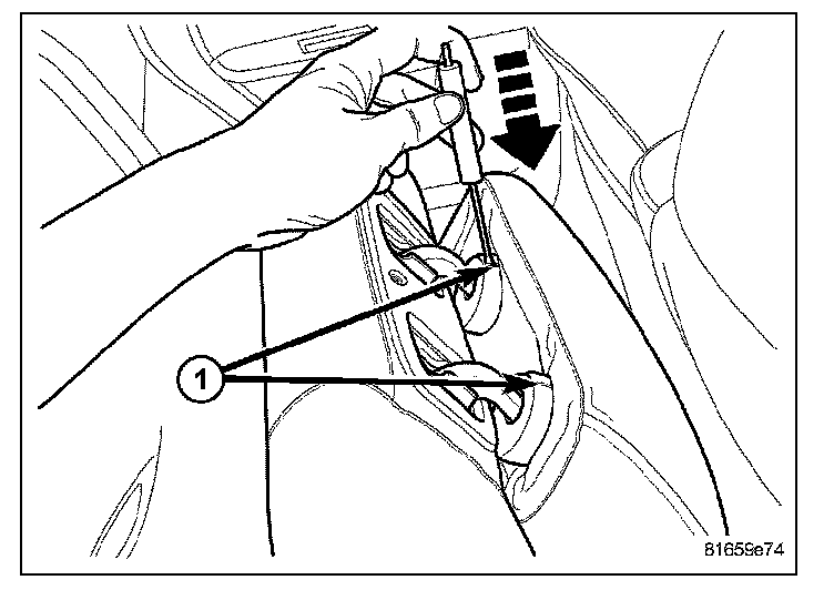 2. Using a small flat bladed tool or equivalent, release the headrest by pressing the tool into the slots (1) on the trim caps.