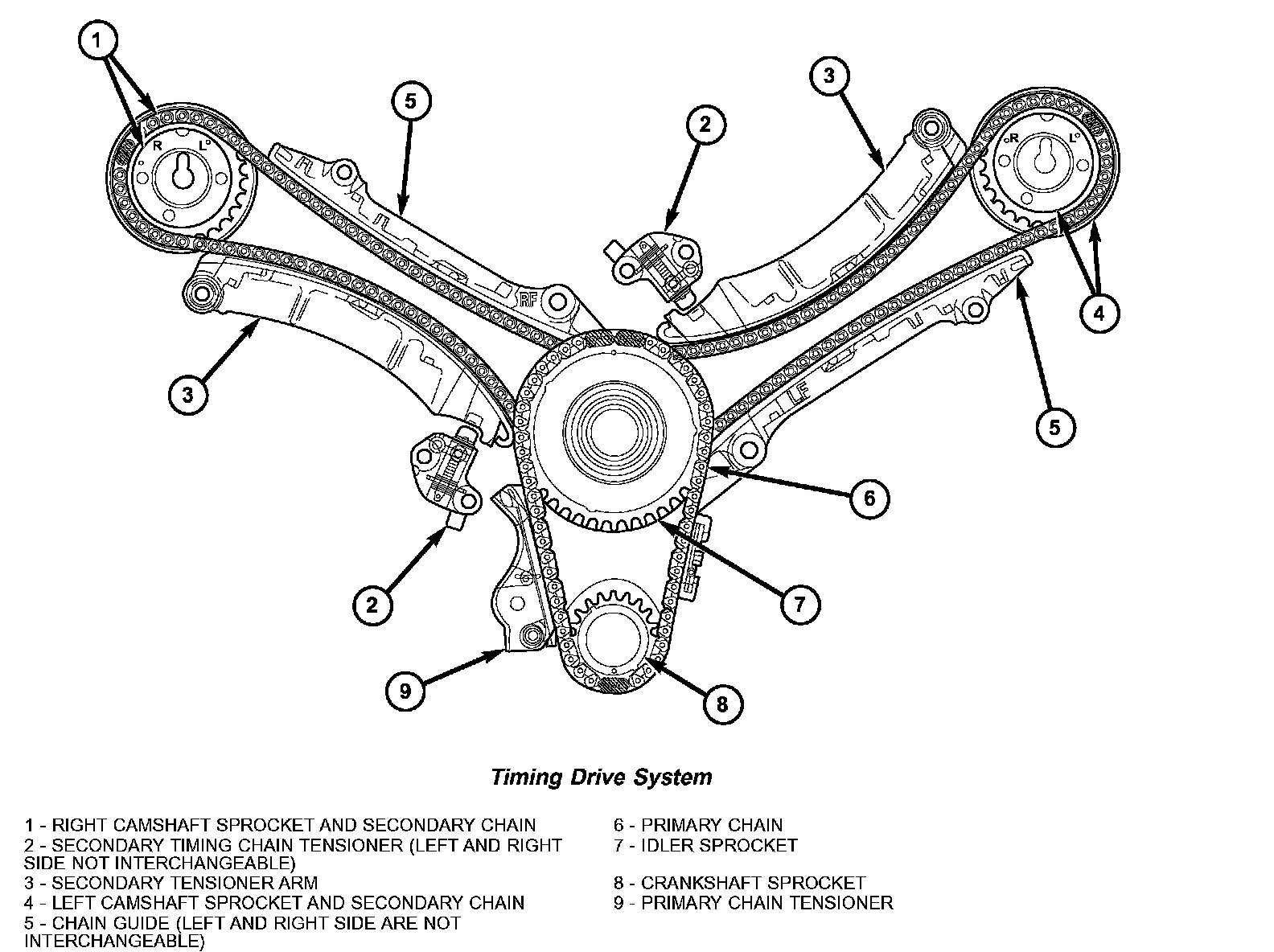 The timing drive system has been designed to provide quiet performance and reliability to support a non-free wheeling engine. Specifically the intake valves are non-free wheeling and can be easily damaged with forceful engine rotation if camshaft-to-crankshaft timing is incorrect. The timing drive system consists of a primary chain, two secondary timing chain drives and a counterbalance shaft drive.