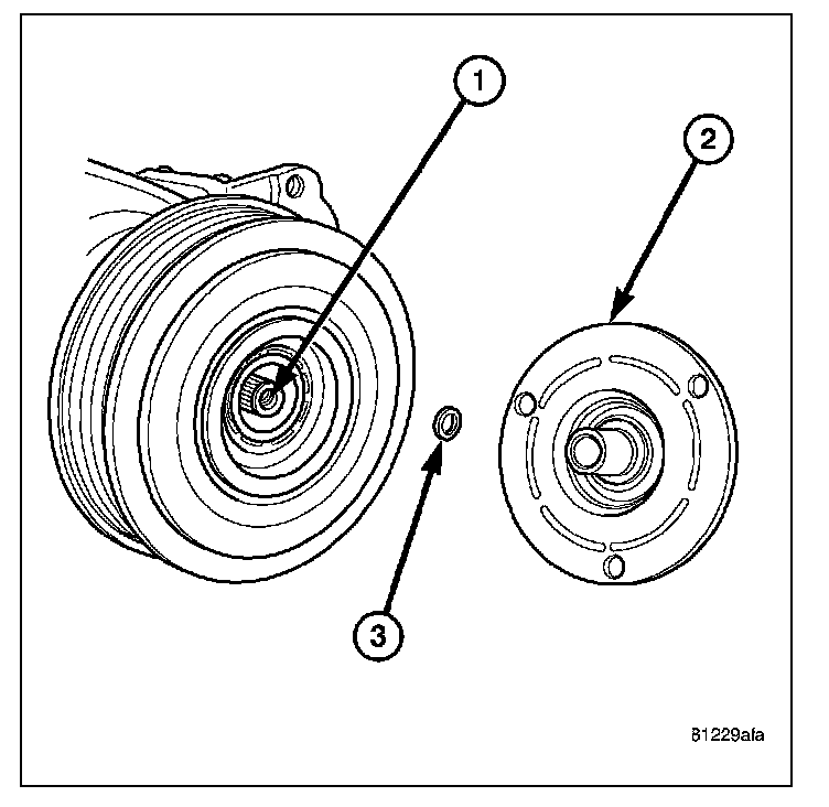 Examine the friction surfaces of the pulley and the clutch plate (2) for wear. The pulley and clutch plate should be replaced if there is excessive wear or scoring.