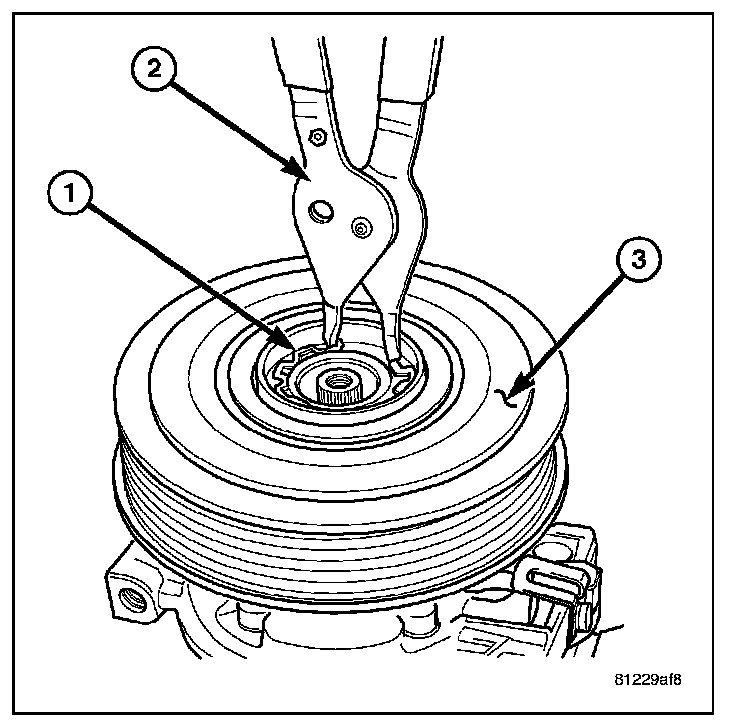 4. Using snap ring pliers (2), install the snap ring (1) that secures the pulley and bearing assembly (3) to the front of the A/C compressor. Be certain that the snap ring is fully and properly seated in the groove.