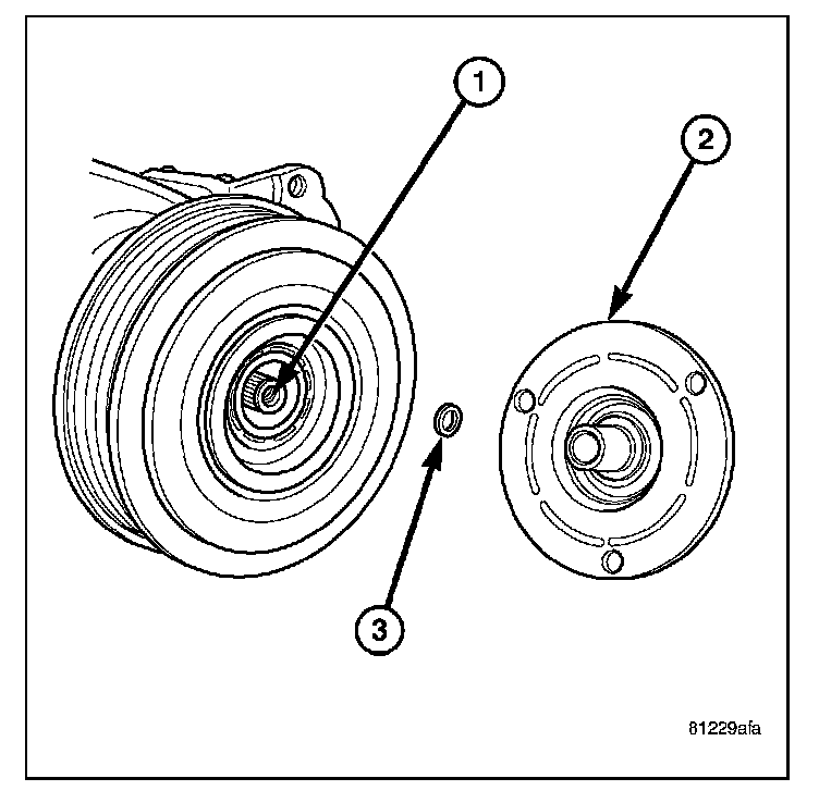 5. If the original clutch plate (2) and pulley and bearing assembly are to be reused, reinstall the original shim(s) (3) onto the compressor shaft (1). If a new clutch plate and pulley and bearing assembly are being used, install a trial stack of shims 2.54 mm (0.010 in.) thick onto the compressor shaft.