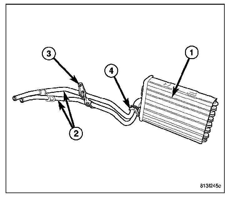 The heater core (1) is mounted into the HVAC air distribution housing, located behind the instrument panel. The heater core is a heat exchanger made of rows of tubes and fins. The heater core tubes (2) are attached to the HVAC housing by a bracket and screw (3) and to the heater core by a flange and bolt (4).