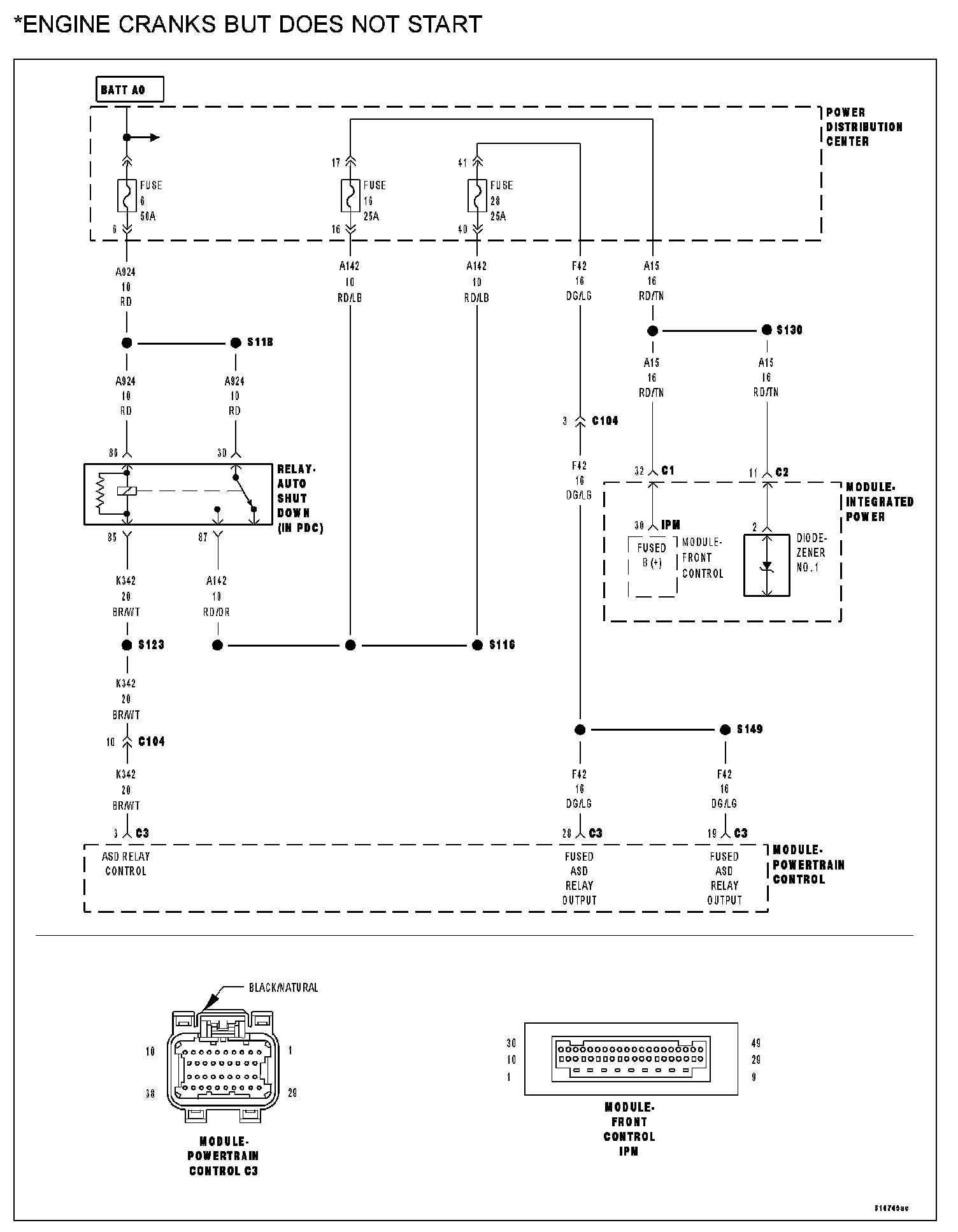 Check for any open fuses in the IPM or Junction Block that may be related to the No Start condition.