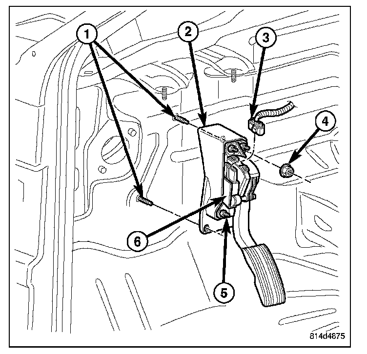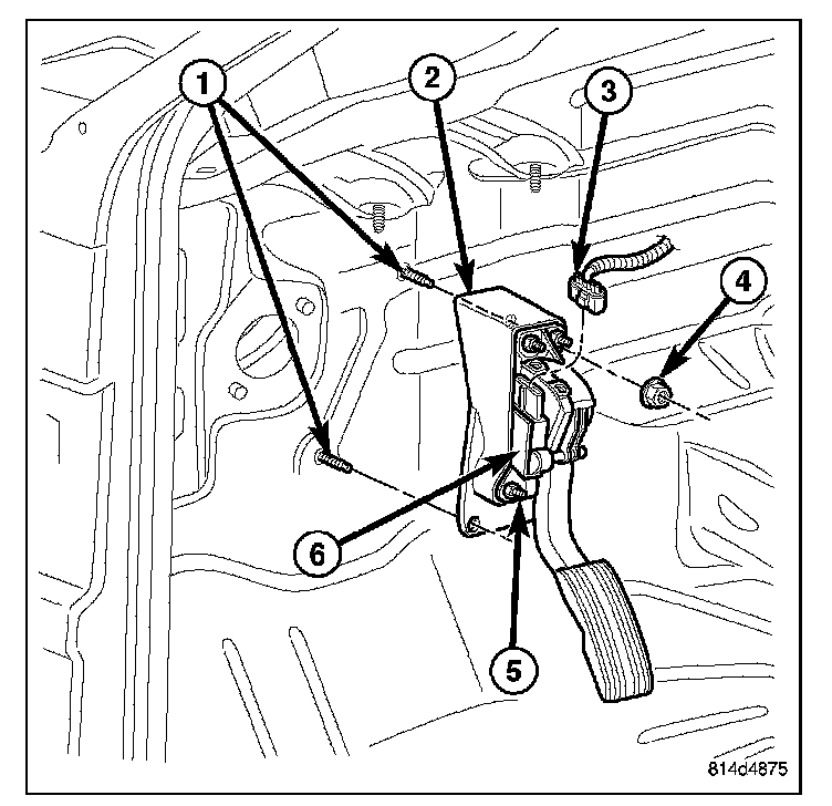 REMOVALThe following procedure applies only to vehicles without the Adjustable Pedal Package (code XAP). It also applies to vehicles equipped with an accelerator pedal position sensor (6).