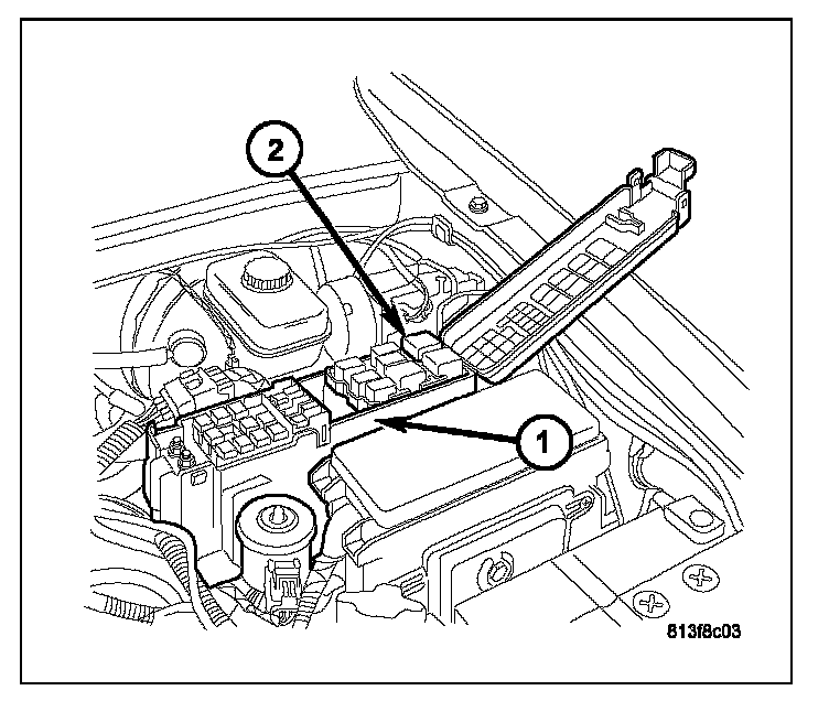 1. Position the front blower motor relay (2) into the proper receptacle of the power distribution center (PDC) (1).