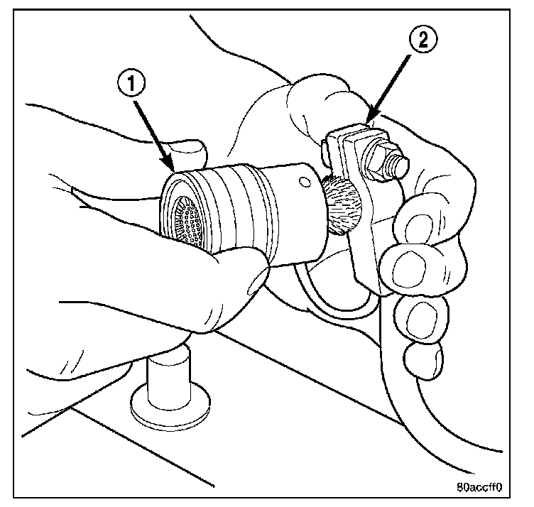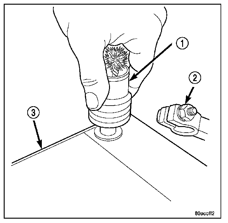 1. Clean the battery cable terminal clamps (2) of all corrosion. Remove any corrosion using a wire brush or a post and terminal cleaning tool (1), and a sodium bicarbonate (baking soda) and warm water cleaning solution.