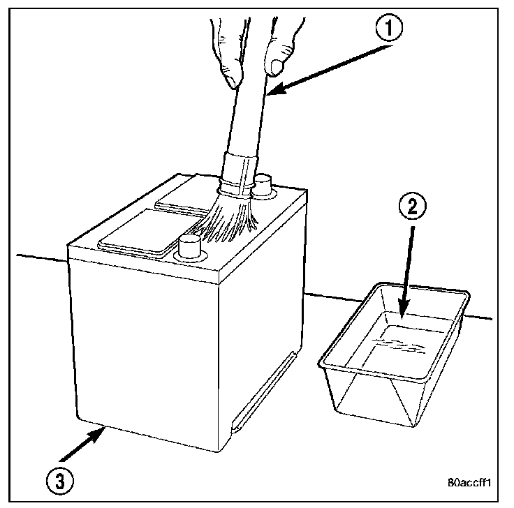 3. If the removed battery is to be reinstalled, clean the outside of the battery case (3) and the top cover with a sodium bicarbonate (baking soda) and warm water cleaning solution (2) using a stiff bristle parts cleaning brush (1) to remove any acid film. Rinse the battery with clean water. Ensure that the cleaning solution does not enter the battery cells through the vent holes. If the battery is being replaced, confirm that the replacement battery is the correct size and has the correct ratings for the vehicle.