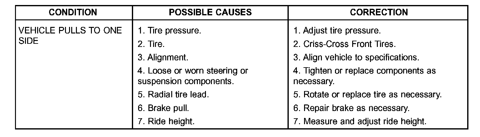 PRE-ALIGNMENT INSPECTIONBefore starting wheel alignment, the following inspection and necessary corrections must be completed. Refer to Suspension and Steering System Diagnosis Chart below for additional information.