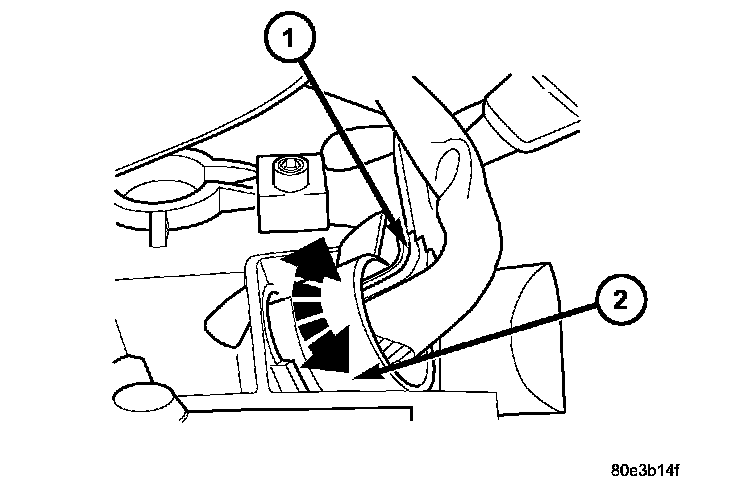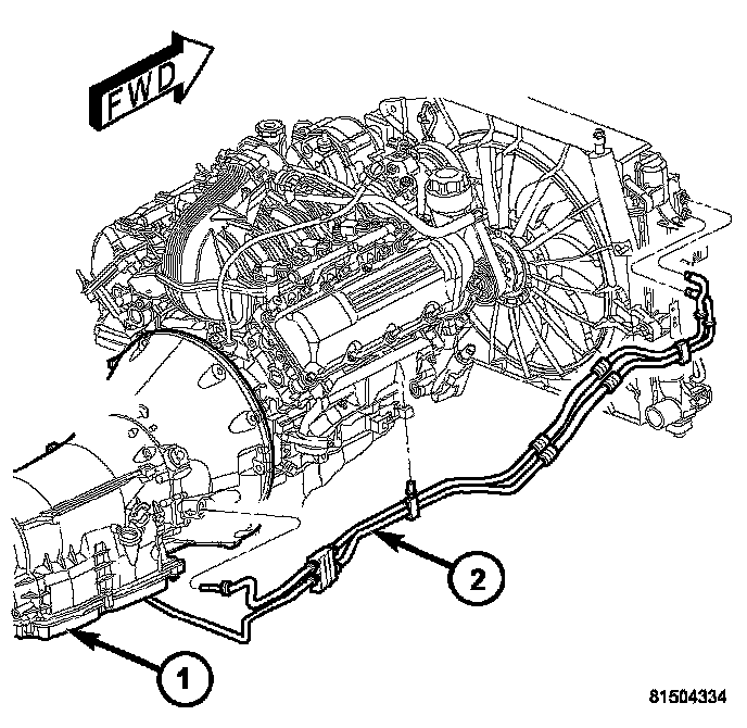 13. Disconnect transmission fluid cooler lines (2) at transmission (1).