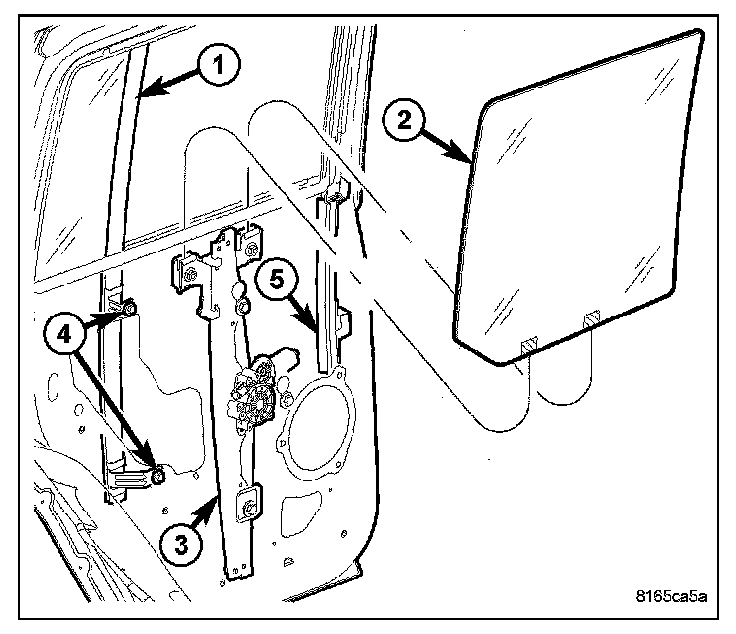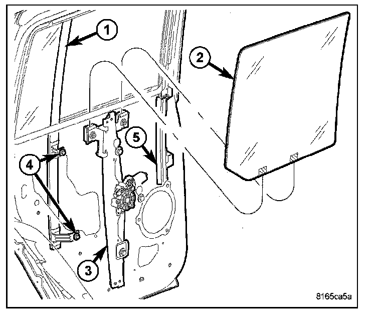 3. Using the regulator (2), move the rear door glass to full up.