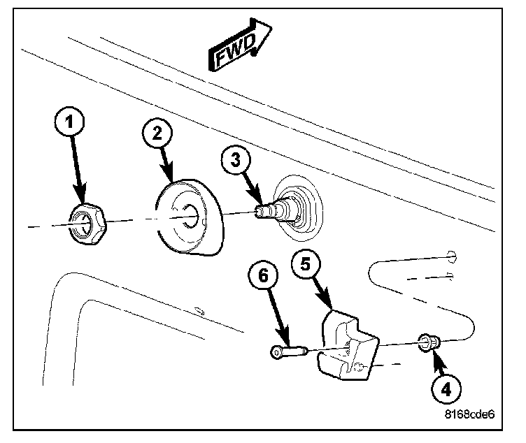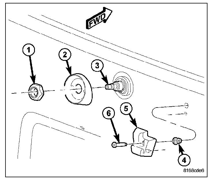 4. Install and tighten the nut (1) that secures the bezel and the output shaft to the liftgate outer panel. Tighten the nut to 5 N.m (43 in. lbs.).
