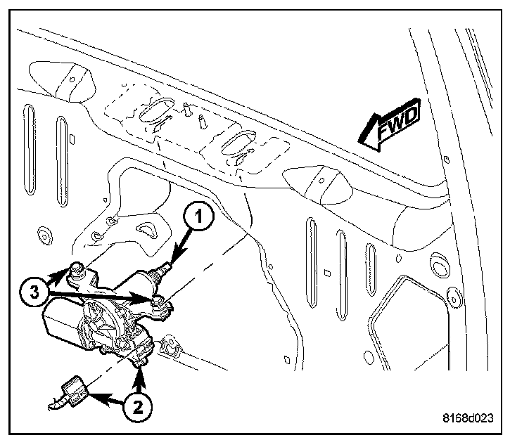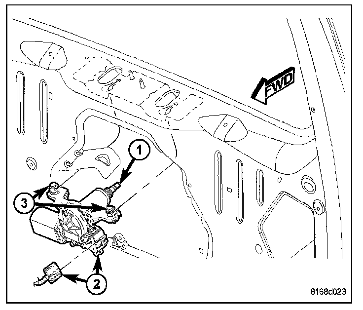 1. Position the rear wiper motor and mounting bracket into the liftgate as a unit with the two mounting screws (3) loosened.