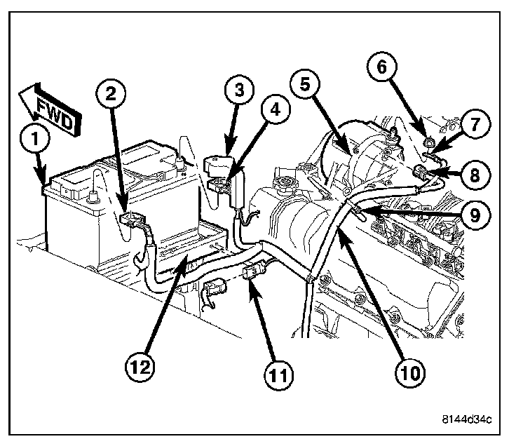 6. Install the battery wire harness three pin connector (11) onto the battery tray (12).