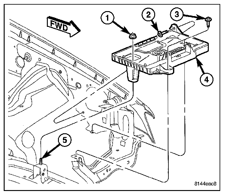 5. Remove the one nut (1) that secures the rear of the battery tray to the stud (5) on the front frame rail.