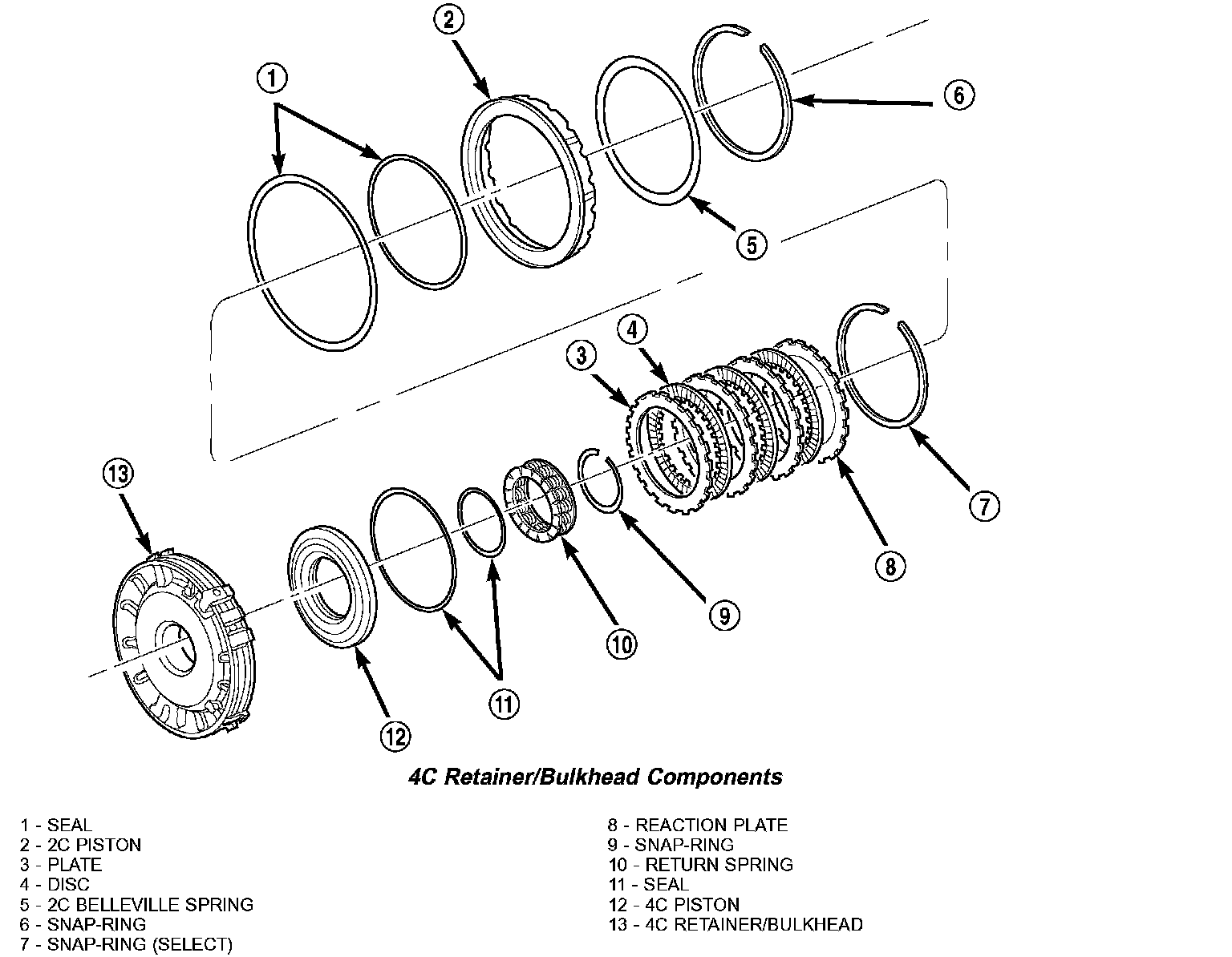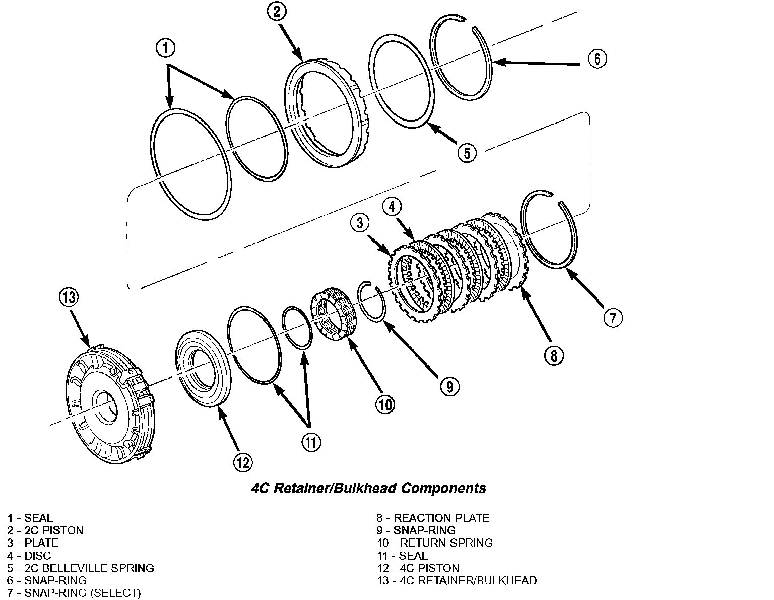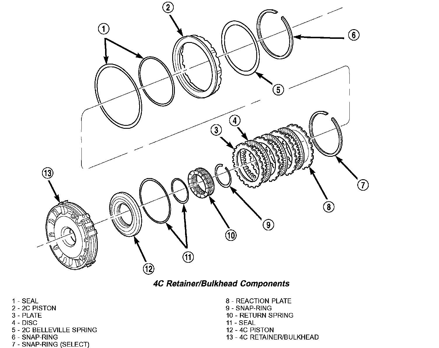 1. Remove the 2C piston Belleville spring snap-ring (6) from the 4C retainer/bulkhead (13).
