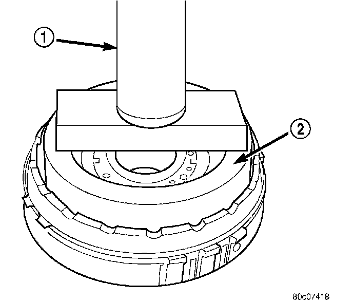 6. Using Spring Compressor 8250 (2) and a suitable shop press (1), compress the 4C piston return spring and remove the snap-ring.