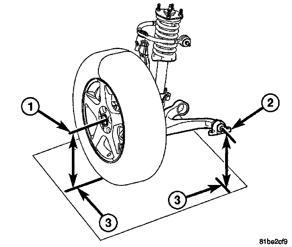 2. Front Cradle Height - On each side of the vehicle, measure the vertical distance between the center of the lower control arm forward pivot bolt (2) to the ground (3). Record the measurement.