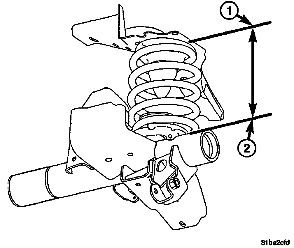 4. Rear - On each side of the vehicle measure the distance from the axle tube (2) and the bottom of the upper spring perch (1).
