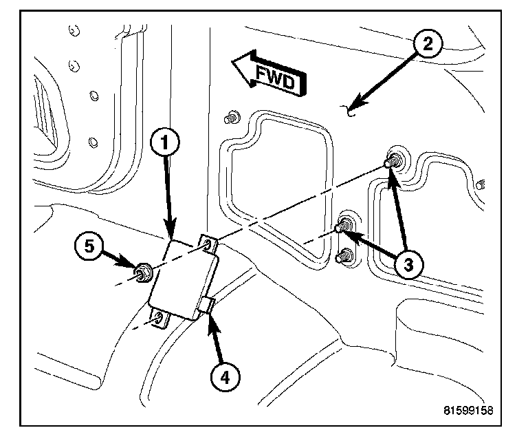 4. Remove the two nuts (5) that secure the module to the studs (3) on the quarter inner panel.