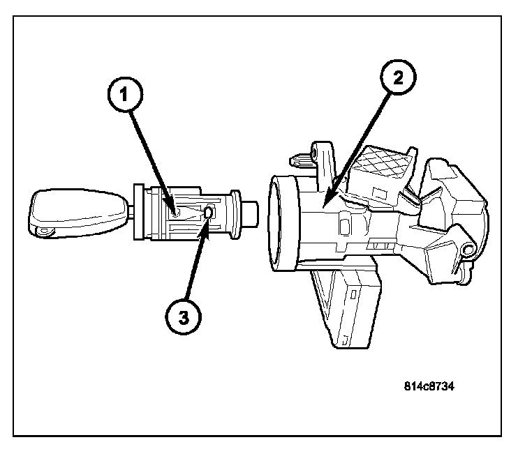 3. To remove key lock cylinder (1) from housing (2), rotate key to ON position while pressing on release tab (3). This tab (3) is located on the right side of the switch assembly.