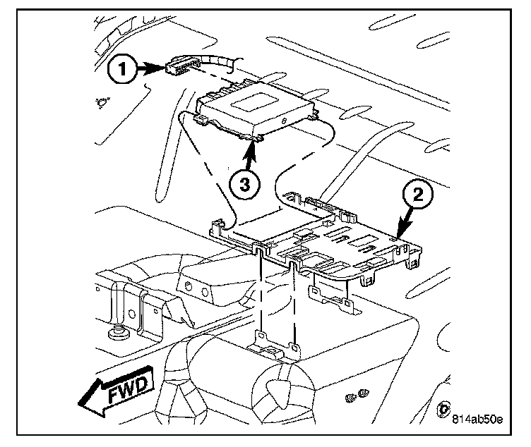 4. Using a trim stick (special tool #C-4755) or equivalent, gently pry back on the retaining tabs on the mounting plate (2) and remove module.