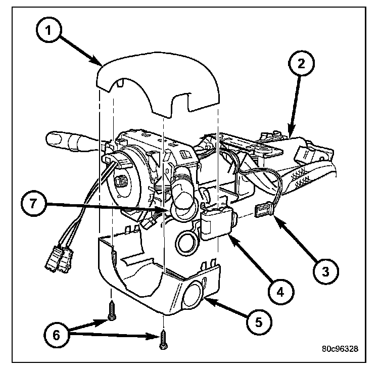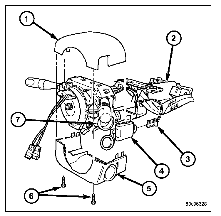 3. From below the steering column (2), remove the two screws (6) that secure the lower shroud (5) to the upper shroud (1).