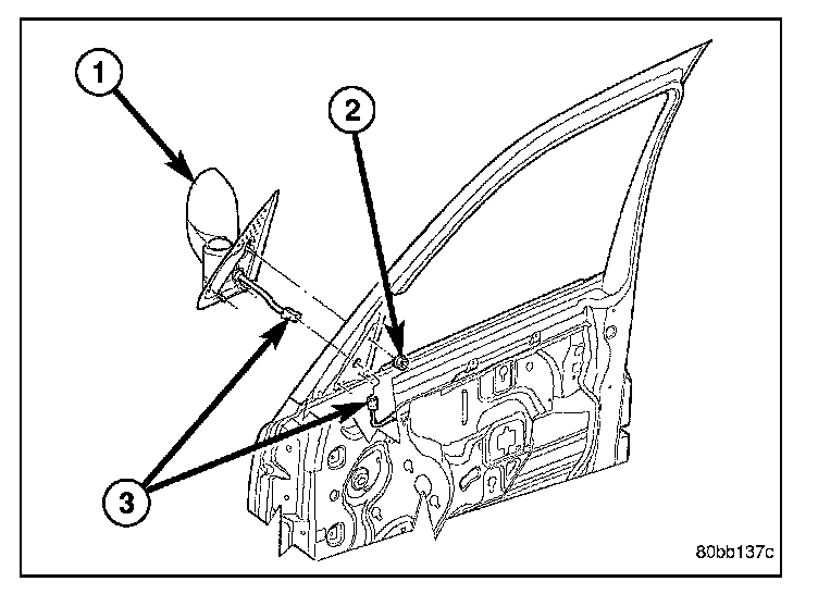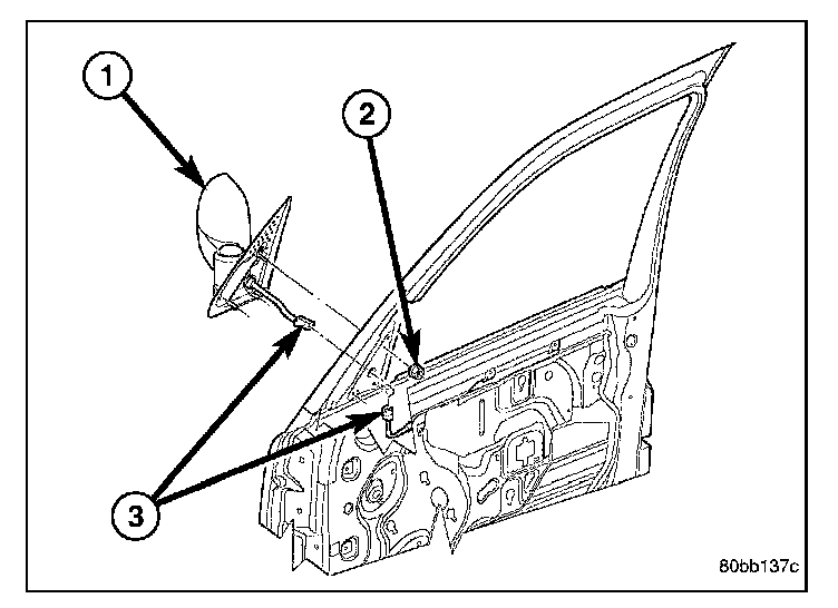 3. Remove the three nuts (2) and remove the mirror assembly (1).