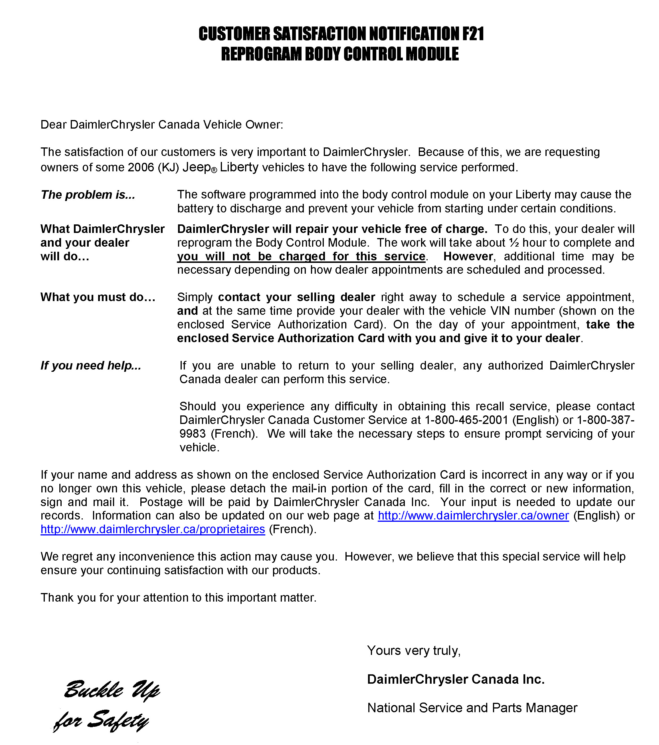 CUSTOMER SATISFACTION NOTIFICATION F21 - REPROGRAM BODY CONTROL MODULE