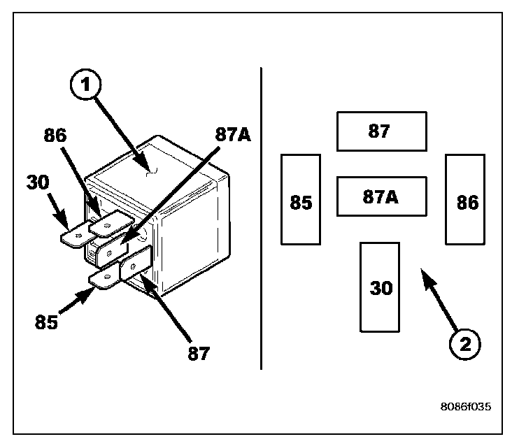 2. A relay in the de-energized position should have continuity between terminals 87A and 30, and no continuity between terminals 87 and 30. If OK, go to Step 3. If not OK, replace the faulty relay.