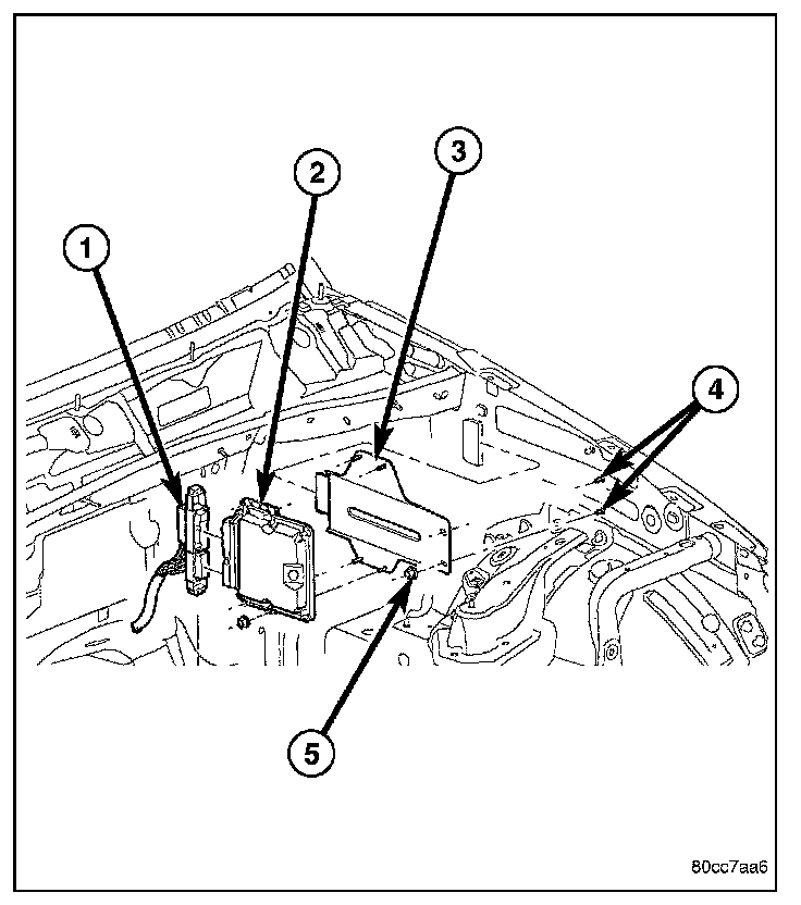 4. Remove ECM (2) and bracket assembly from vehicle.