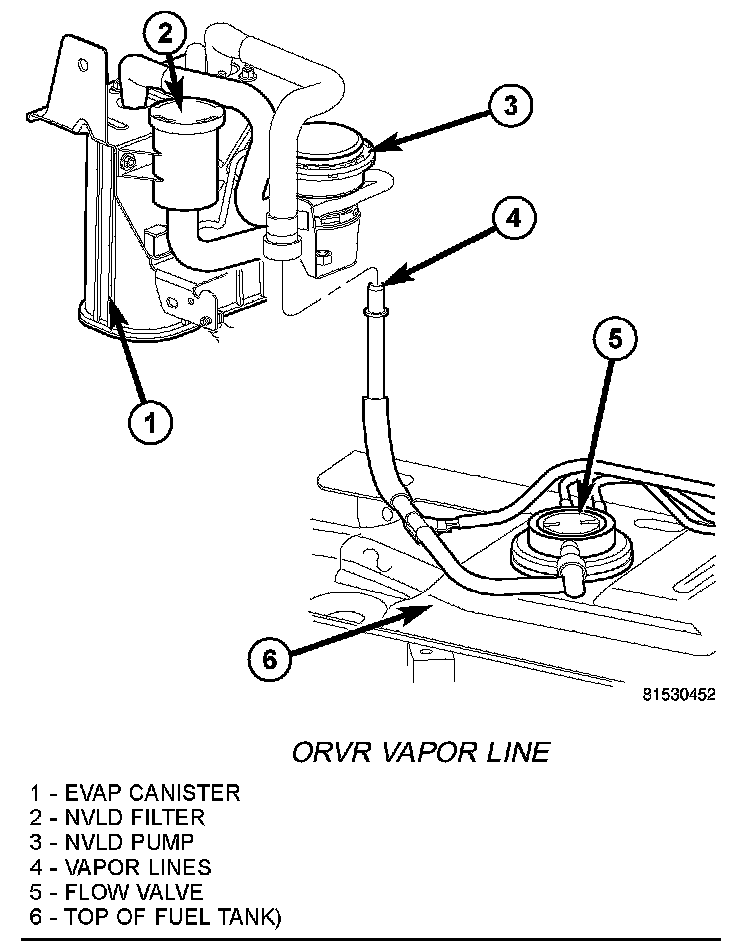 The Natural Vacuum Leak Detection (NVLD) pump (3) is located behind the right-rear wheel and system.