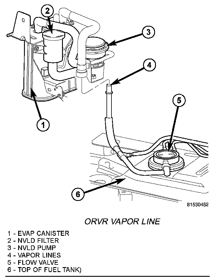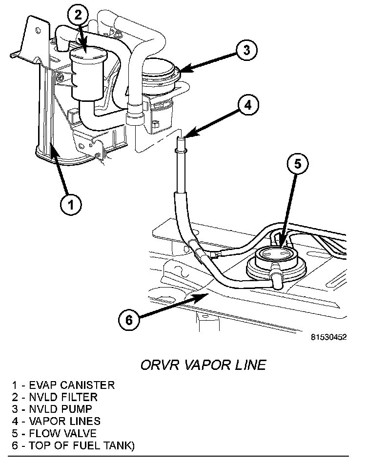 4. A vapor line (4) connects the fuel tank to the EVAP canister and NVLD pump. This connection is made near the right/rear corner of the fuel tank. Carefully disconnect this line. Be very careful not to bend or kink the vapor lines. If lines leak, a Diagnostic Trouble Code (DTC) will be set.