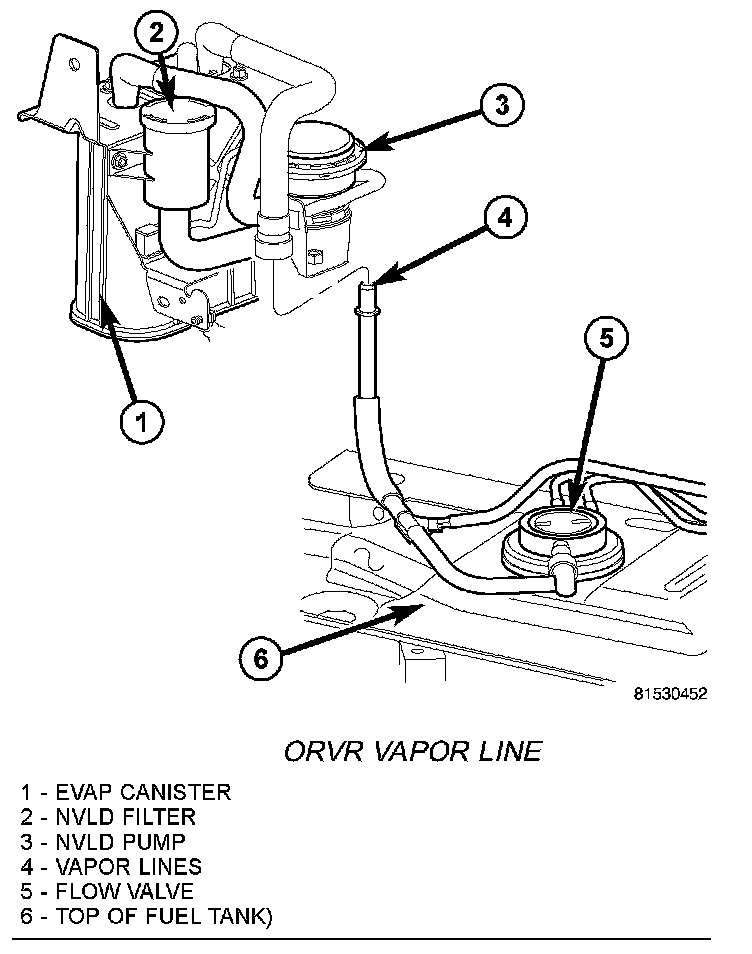 The Natural Vacuum Leak Detection (NVLD) pump (3) and EVAP canister (1) are attached to a common support bracket. This support assembly is located to the rear of the right / rear tire under the plastic wheelhouse liner. The NVLD pump filter is also located near the EVAP canister. The pump and filter are replaced (serviced) as one unit.
