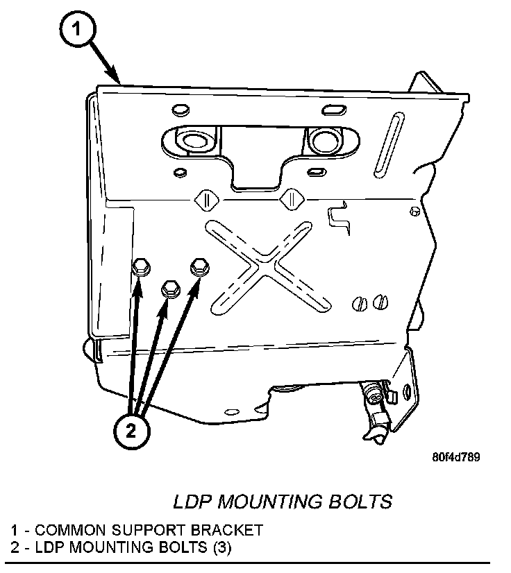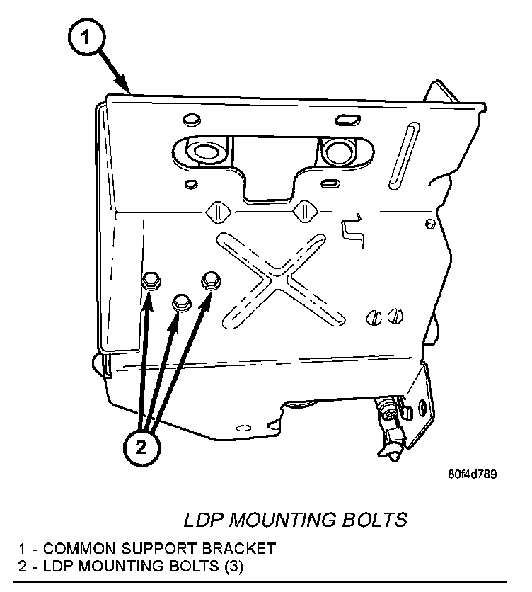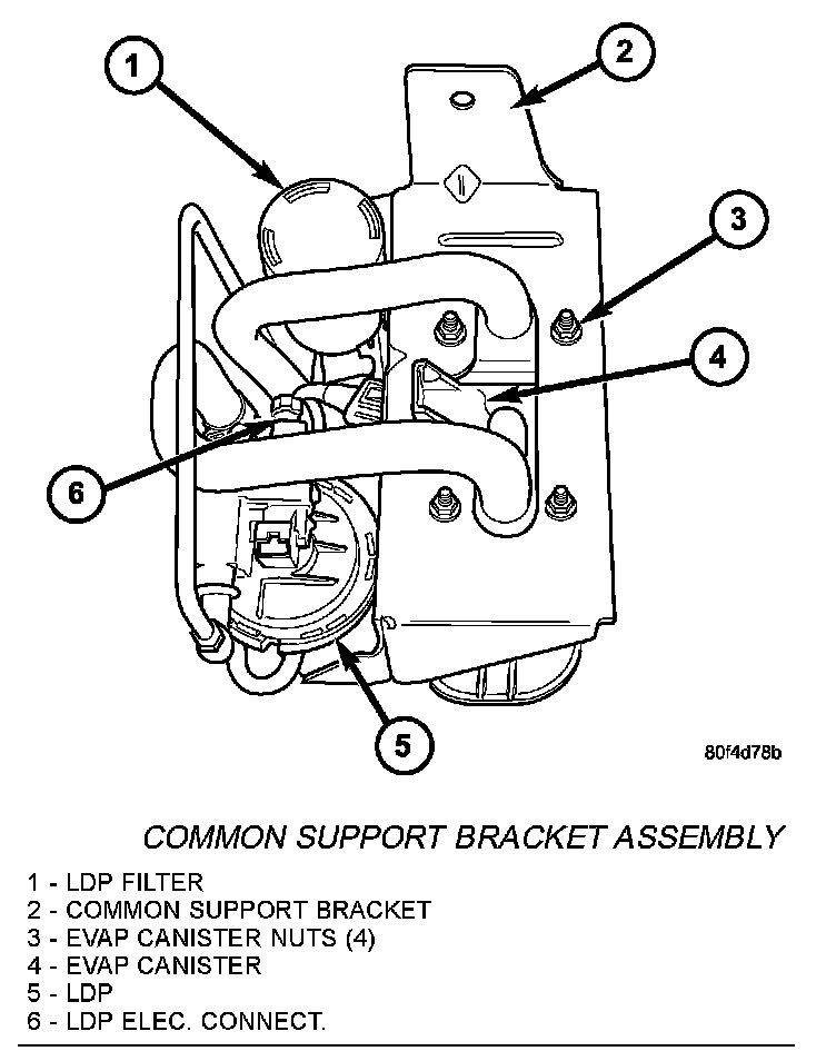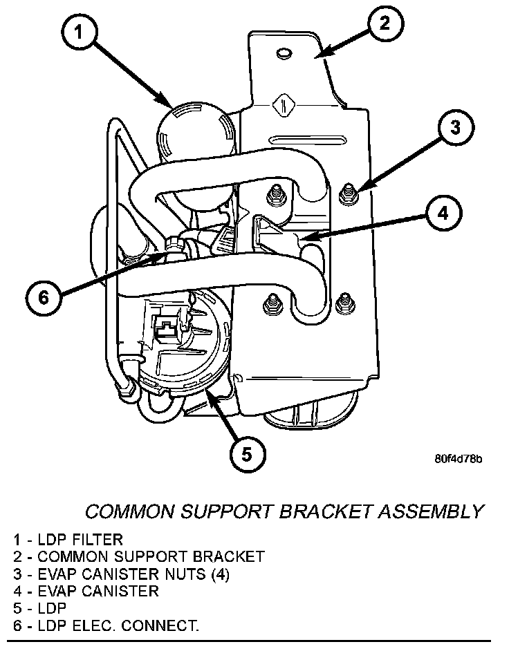 5. Remove common support bracket assembly (2) containing pump, pump filter and EVAP canister from vehicle. While lowering this assembly, disconnect pump electrical connector (6) at LDP pump. Do not allow the assembly to hang from the wire harness.