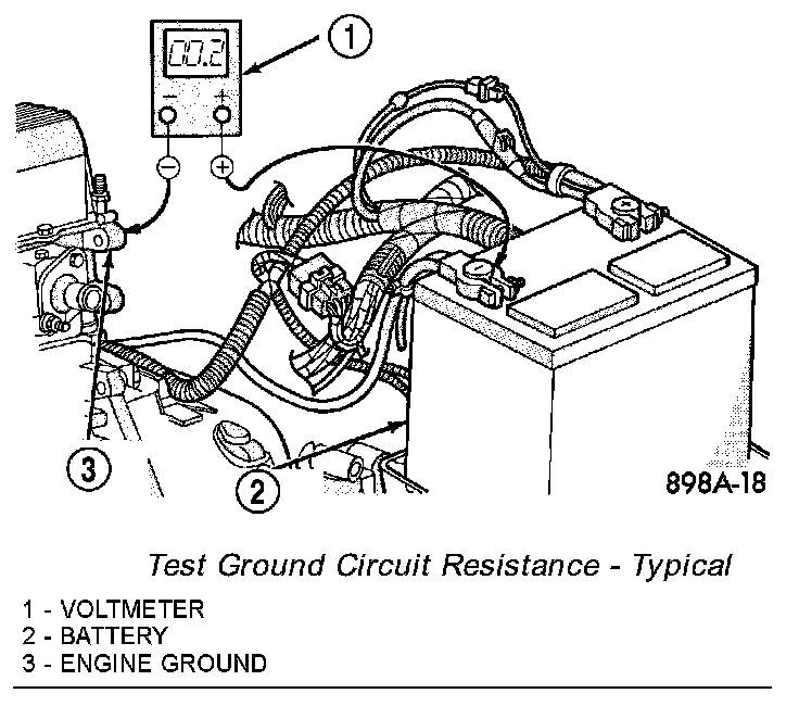 1. Connect the positive lead of the voltmeter to the battery negative terminal post. Connect the negative lead of the voltmeter to the battery negative cable terminal clamp. Rotate and hold the ignition switch in the Start position. Observe the voltmeter. If voltage is detected, correct the poor contact between the battery negative cable terminal clamp and the battery negative terminal post.