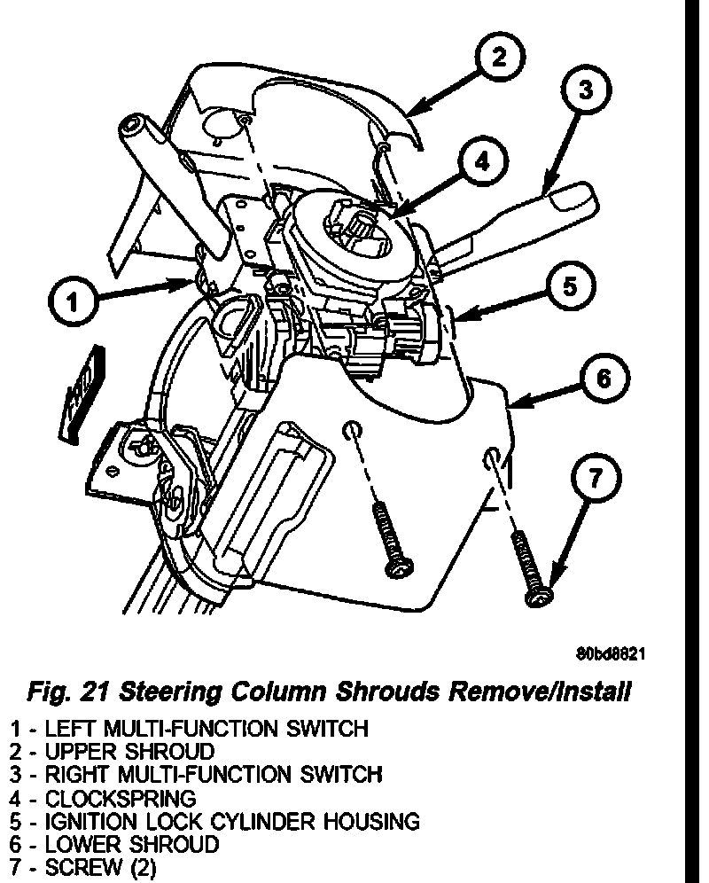 3. From below the steering column, remove the two screws that secure the lower steering column shroud to the upper shroud (Fig. 21).