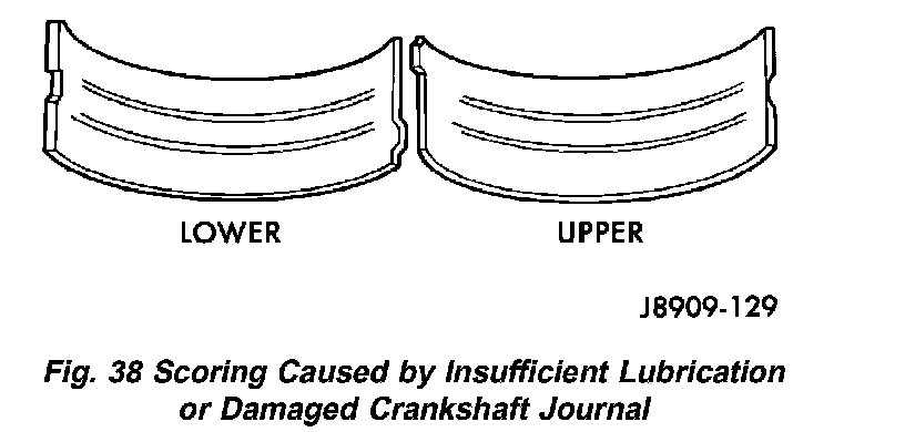 Inspect the connecting rod bearings for scoring and bent alignment tabs (Fig. 36) (Fig. 37). Check the bearings for normal wear patterns, scoring, grooving, fatigue and pitting (Fig. 38). Replace any bearing that shows abnormal wear.