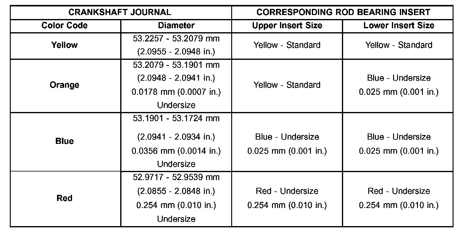 11. FOR EXAMPLE: If the initial clearance was 0.0762 mm (0.003 inch), 0.025 mm (0.001 inch) undersize inserts would reduce the clearance by 0.025 mm (0.001 inch). The clearance would be 0.002 inch and within specification. A 0.051 mm (0.002 inch) undersize insert would reduce the initial clearance an additional 0.013 mm (0.0005 inch). The clearance would then be 0.038 mm (0.0015 inch).