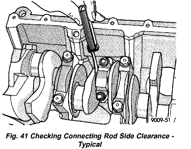 Slide snug-fitting feeler gauge between the connecting rod and crankshaft journal flange (Fig. 41). Replace the connecting rod if the side clearance is not within specification.