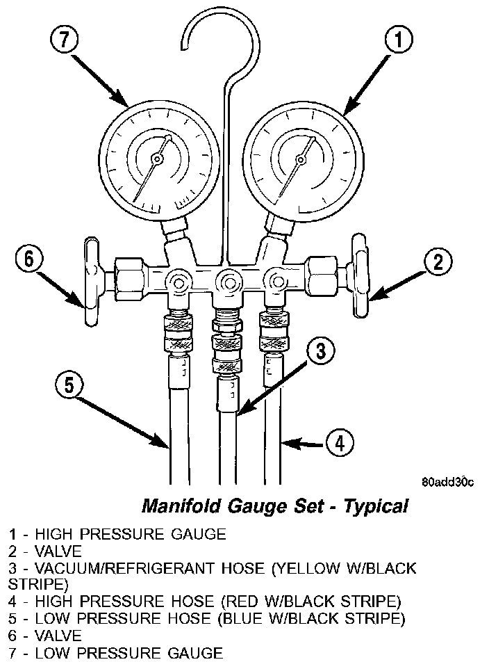 A manifold gauge set may be needed with some recovery/recycling/charging equipment. The service hoses on the gauge set being used should have manual (turn wheel), or automatic back-flow valves at the service port connector ends. This will prevent refrigerant from being released into the atmosphere.