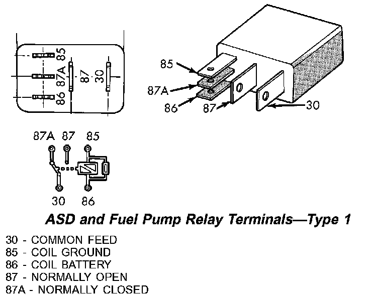 - When the PCM energizes the ASD and fuel pump relays, terminal 87 connects to terminal 30.