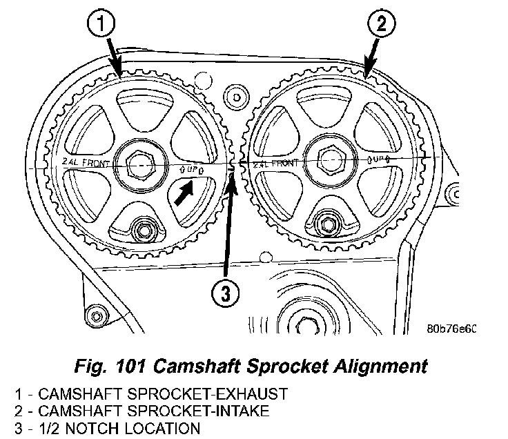2. Set camshafts timing marks so that the exhaust camshaft sprocket is a 1/2 notch below the intake camshaft sprocket (Fig. 101).