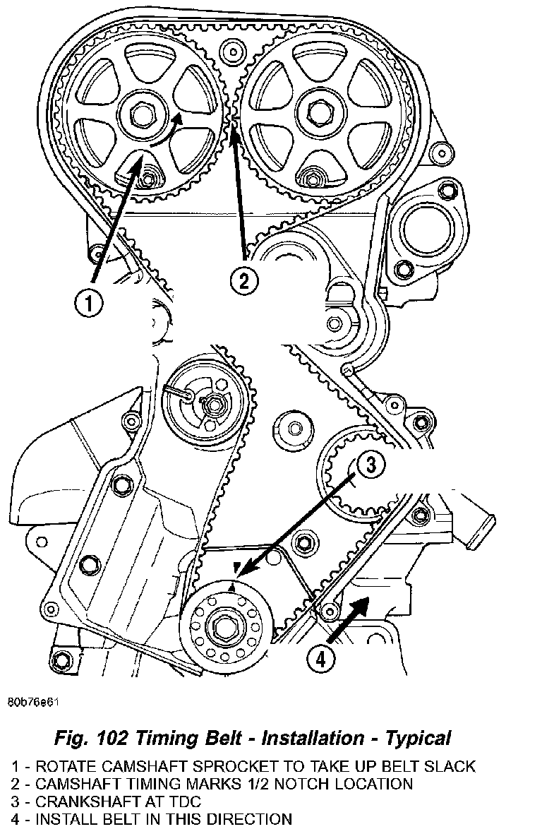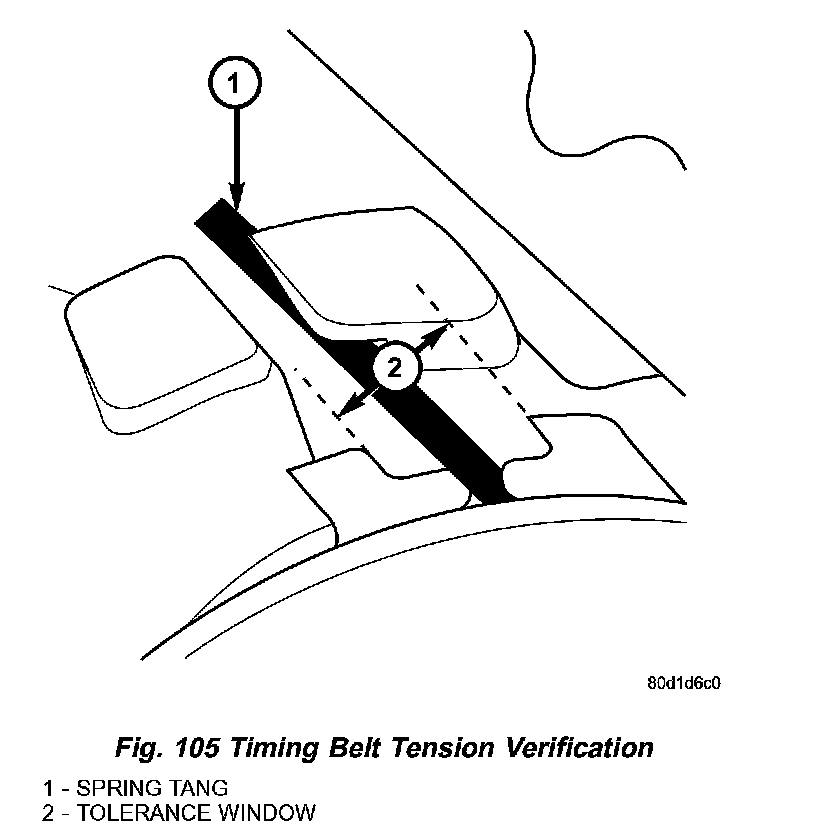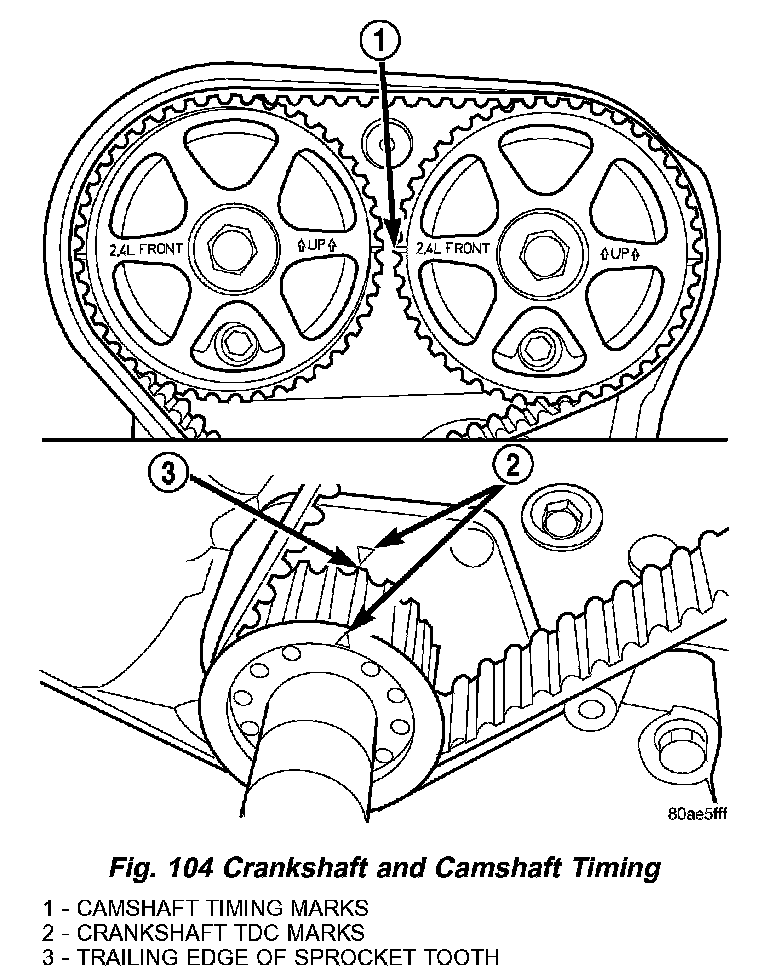 7. Once the timing belt has been installed and tensioner adjusted, rotate the crankshaft CLOCKWISE two complete revolutions manually for seating of the belt, until the crankshaft is repositioned at the TDC position. Verify that the camshaft and crankshaft timing marks are in proper position (Fig. 104).