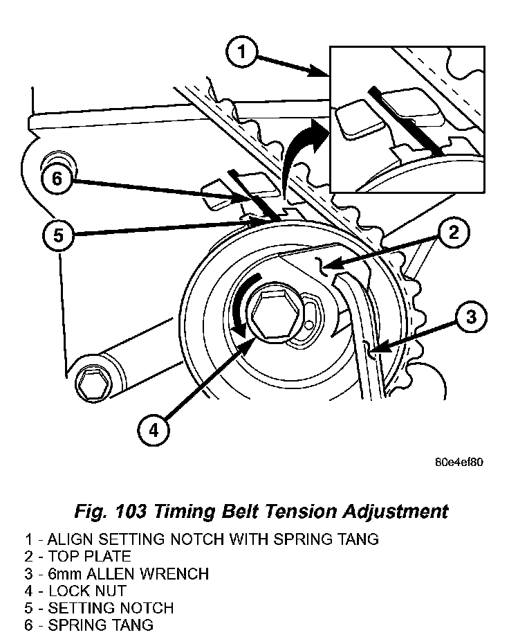 5. Insert a 6 mm Allen wrench into the hexagon opening located on the top plate of the belt tensioner pulley Rotate the top plate COUNTERCLOCKWISE. The tensioner pulley will move against the belt and the tensioner setting notch will eventually start to move clockwise. Watching the movement of the setting notch, continue rotating the top plate counterclockwise until the setting notch is aligned with the spring tang (Fig. 103). Using the allen wrench to prevent the top plate from moving, torque the tensioner lock nut to 30 Nm (22 ft. lbs.). Setting notch and spring tang should remain aligned after lock nut is torqued.