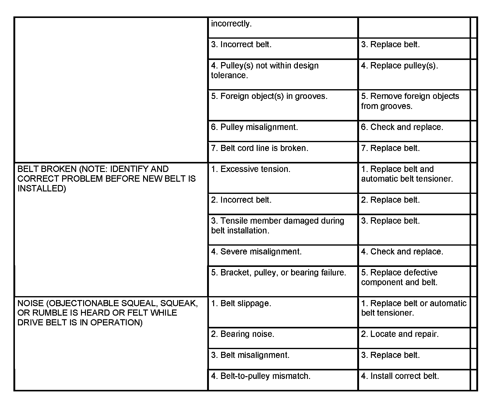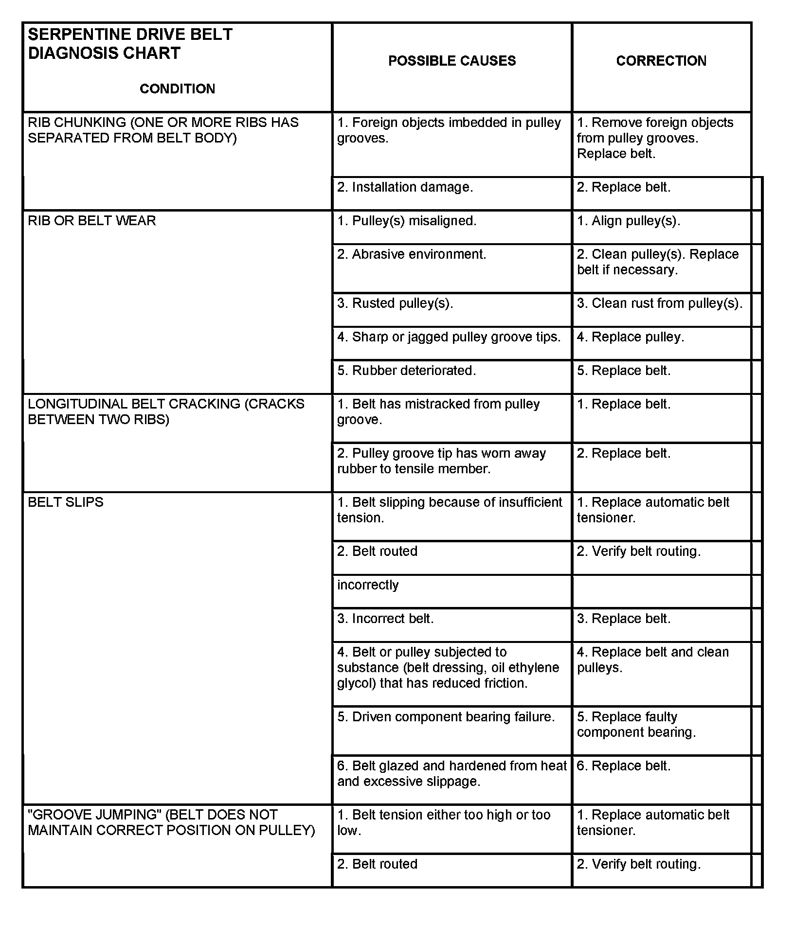 When diagnosing serpentine drive belts, small cracks that run across ribbed surface of belt from rib to rib , are considered normal. These are not a reason to replace belt. However, cracks running along a rib (not across) are not normal. Any belt with cracks running along a rib must be replaced. Also replace belt if it has excessive wear, frayed cords or severe glazing.
