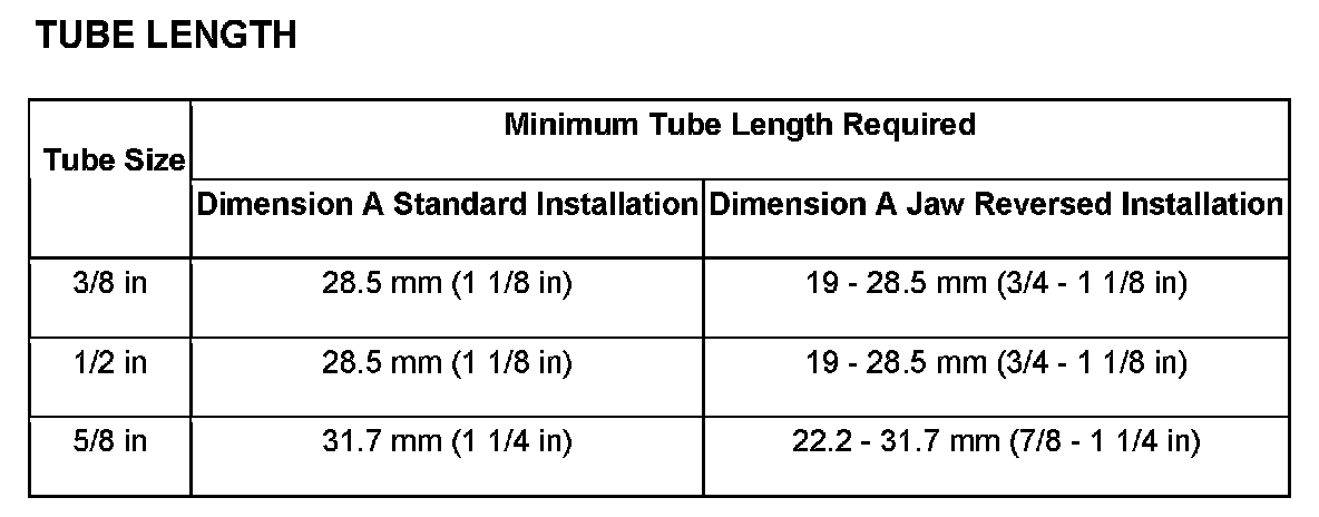6. Mark the cut location(s) on the underbody line(s) needing repair. Check the Tube Length chart for the minimum amount of straight tube required (dimension A) for proper connector fitting installation.