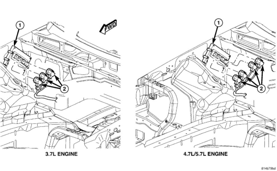 The PCM (1) is attached to the right-front inner fender located in the engine compartment.